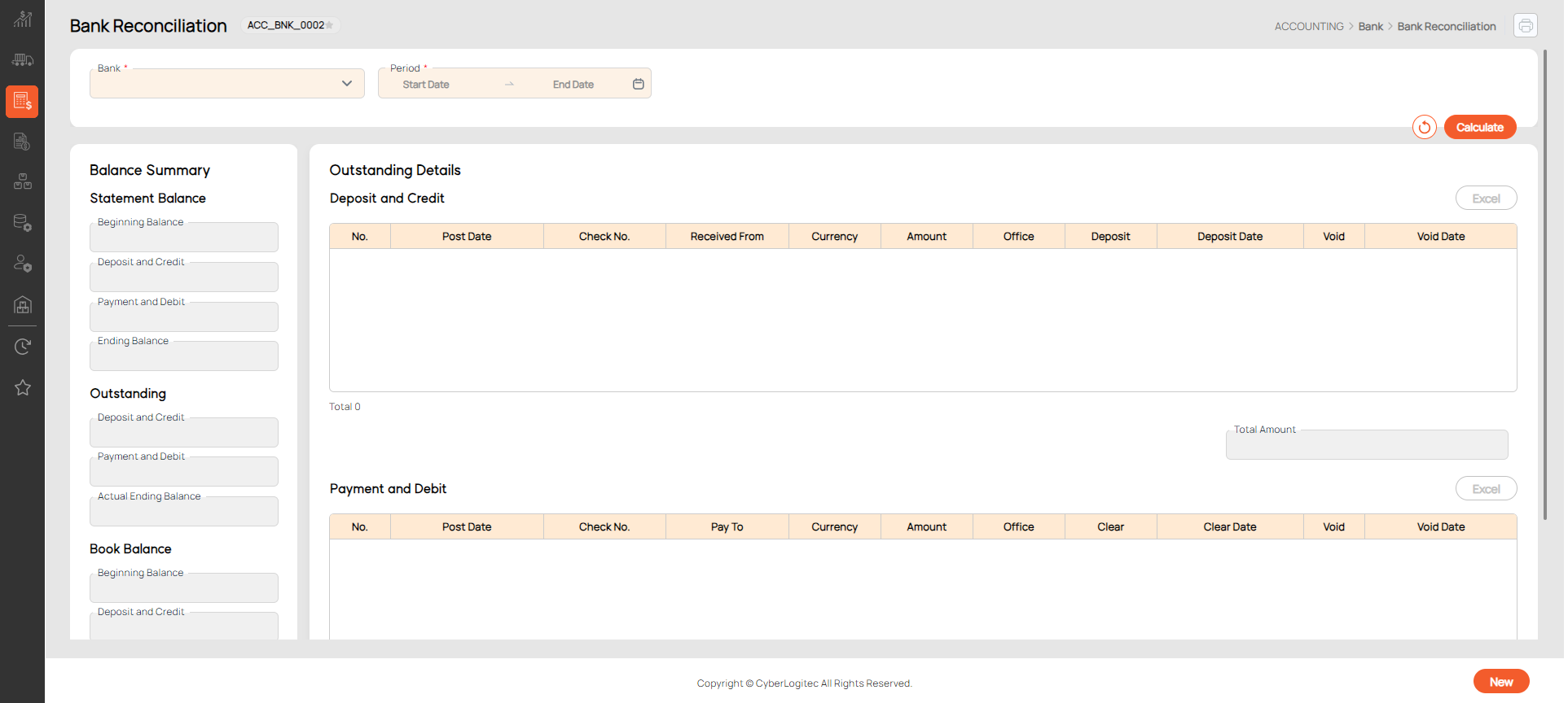 Outstanding shows the total amount of uncleared deposits/payments within a selected period. Outstanding Details shows details of uncleared deposits or payments.