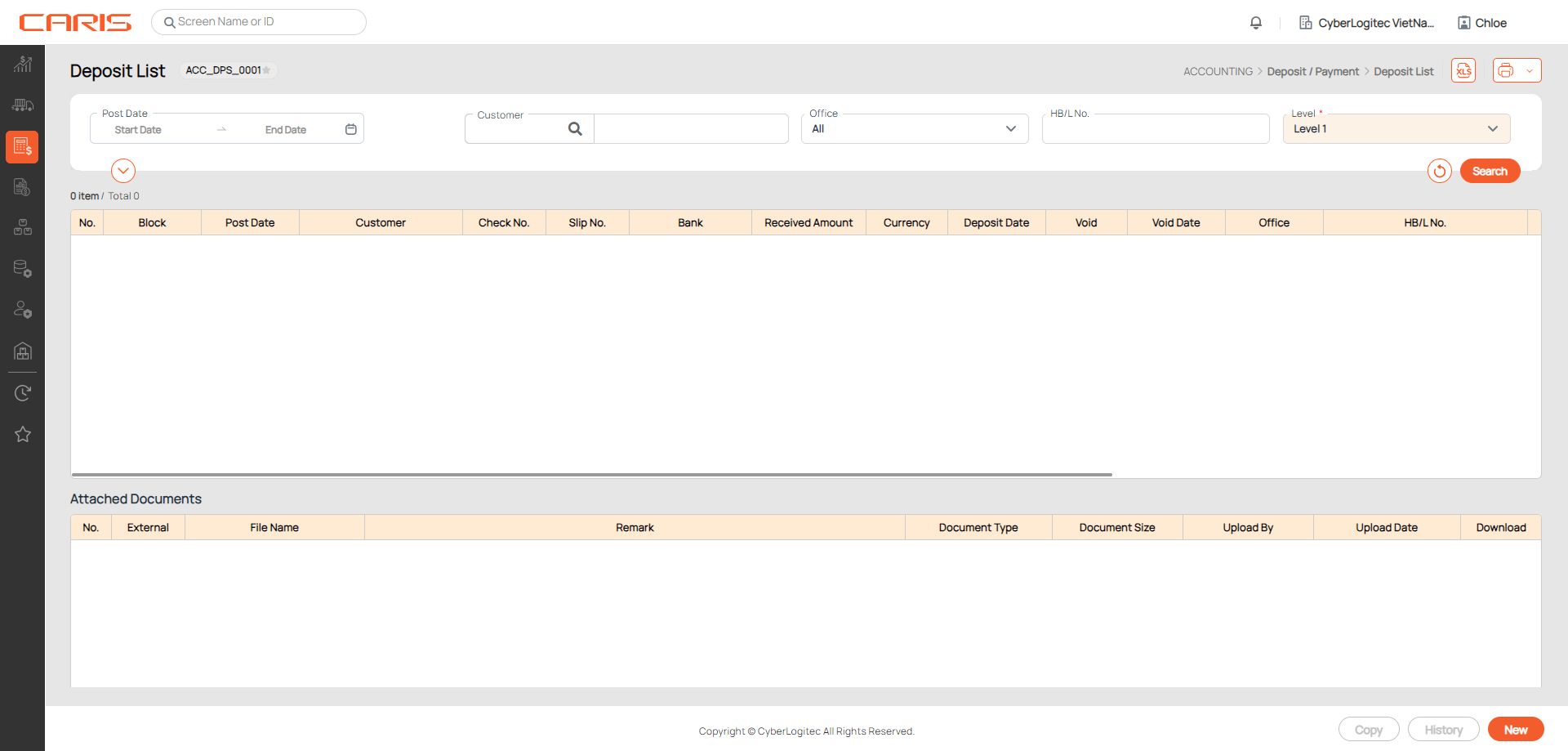 This screen allows you to search all created deposits based on your conditions. You can also copy deposits to create new ones, delete incorrect deposits, or review the history.
