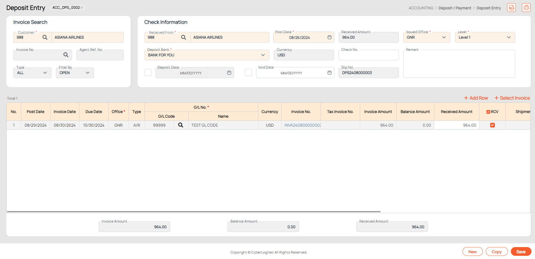 2. Click Copy to go to the Deposit Entry screen. Customer/Received From and Deposit Bank is autofill as selected deposit.