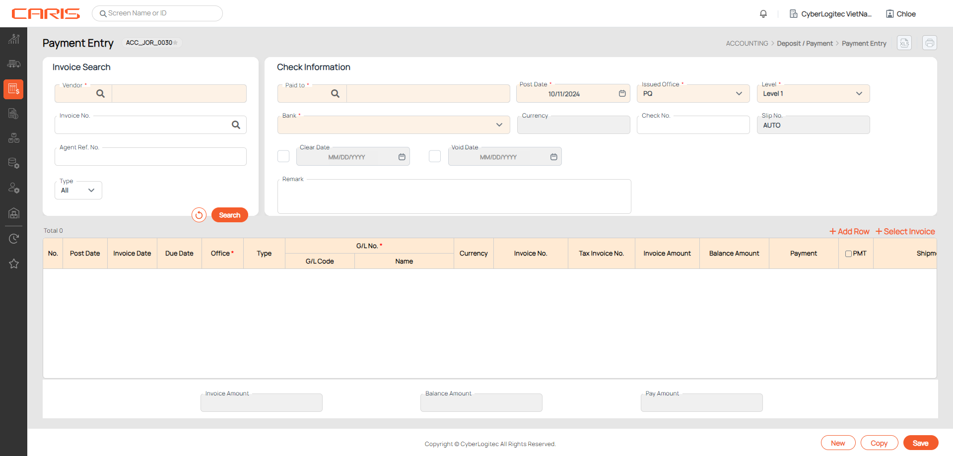 The Payment Entry screen allows you to create, clear and void transactions for payable invoices.