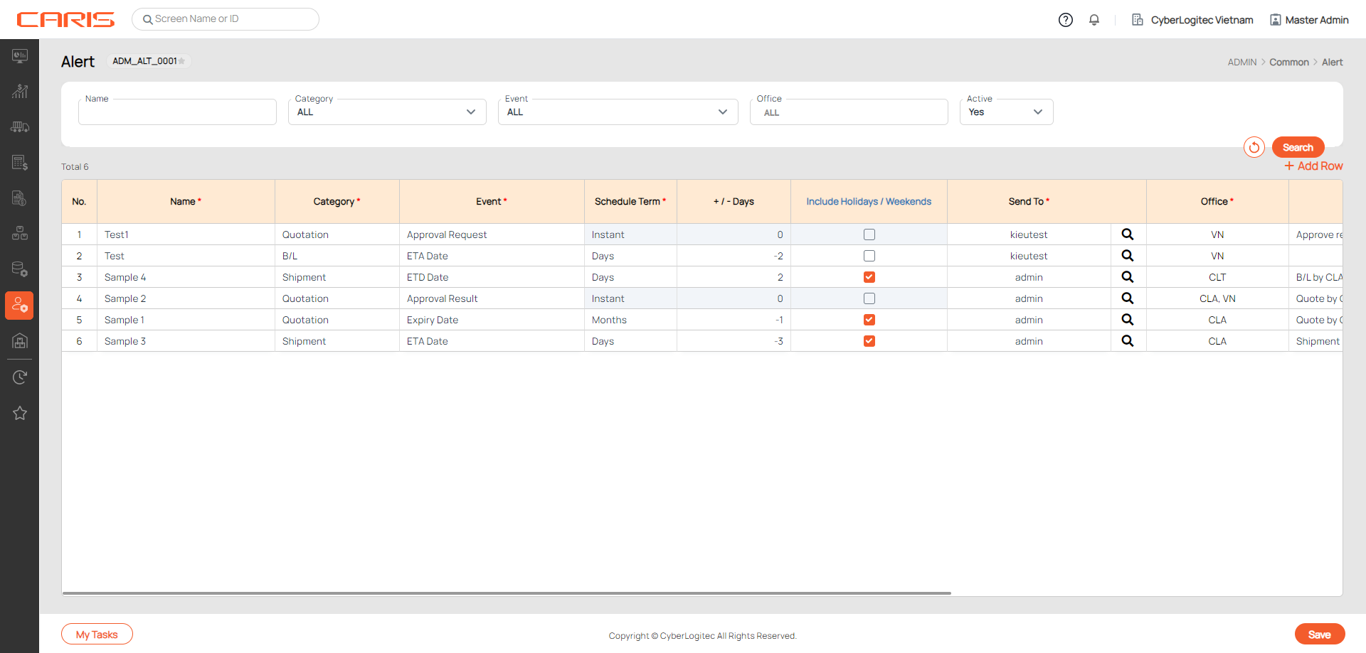 This screen allows you to set up alerts based on event, schedule, recipient and sending method. The alerts can be sent either to your My tasks table or email address.