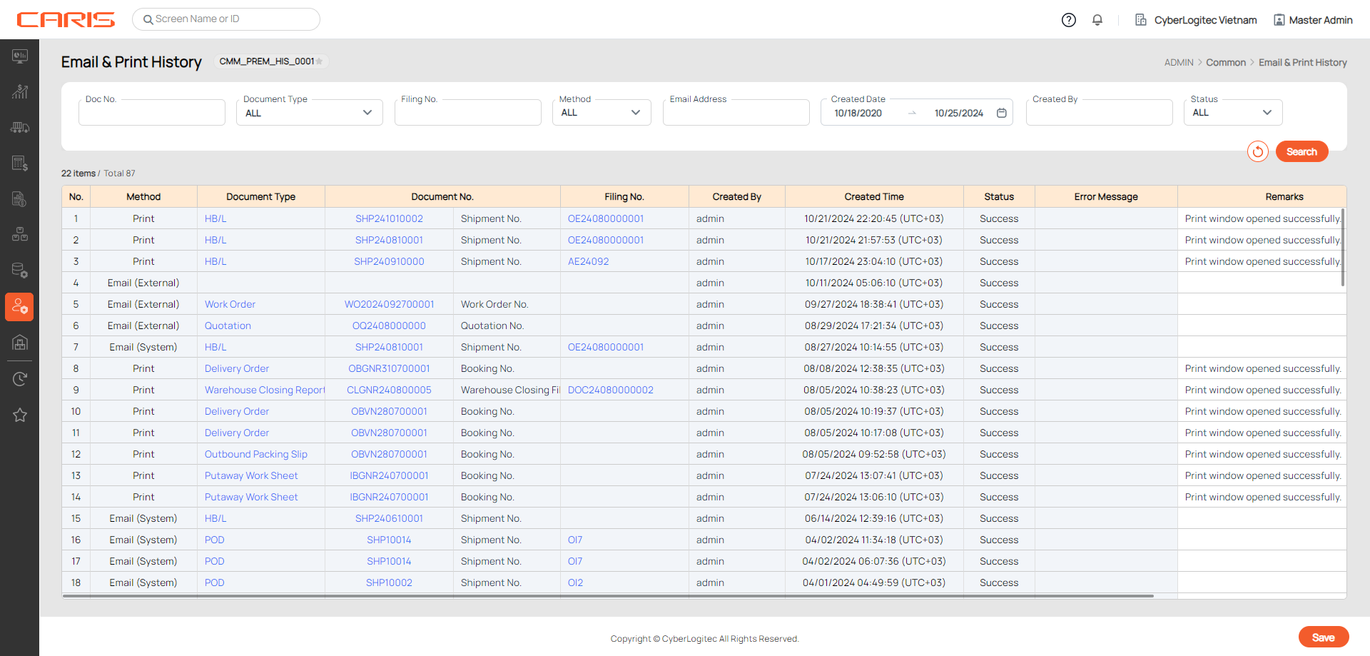 The Email & Print History screen displays a log of all emails and print actions that have been sent from the system. You can use this screen to view the status of any emails or print jobs that you have sent, or add additional remarks if necessary.