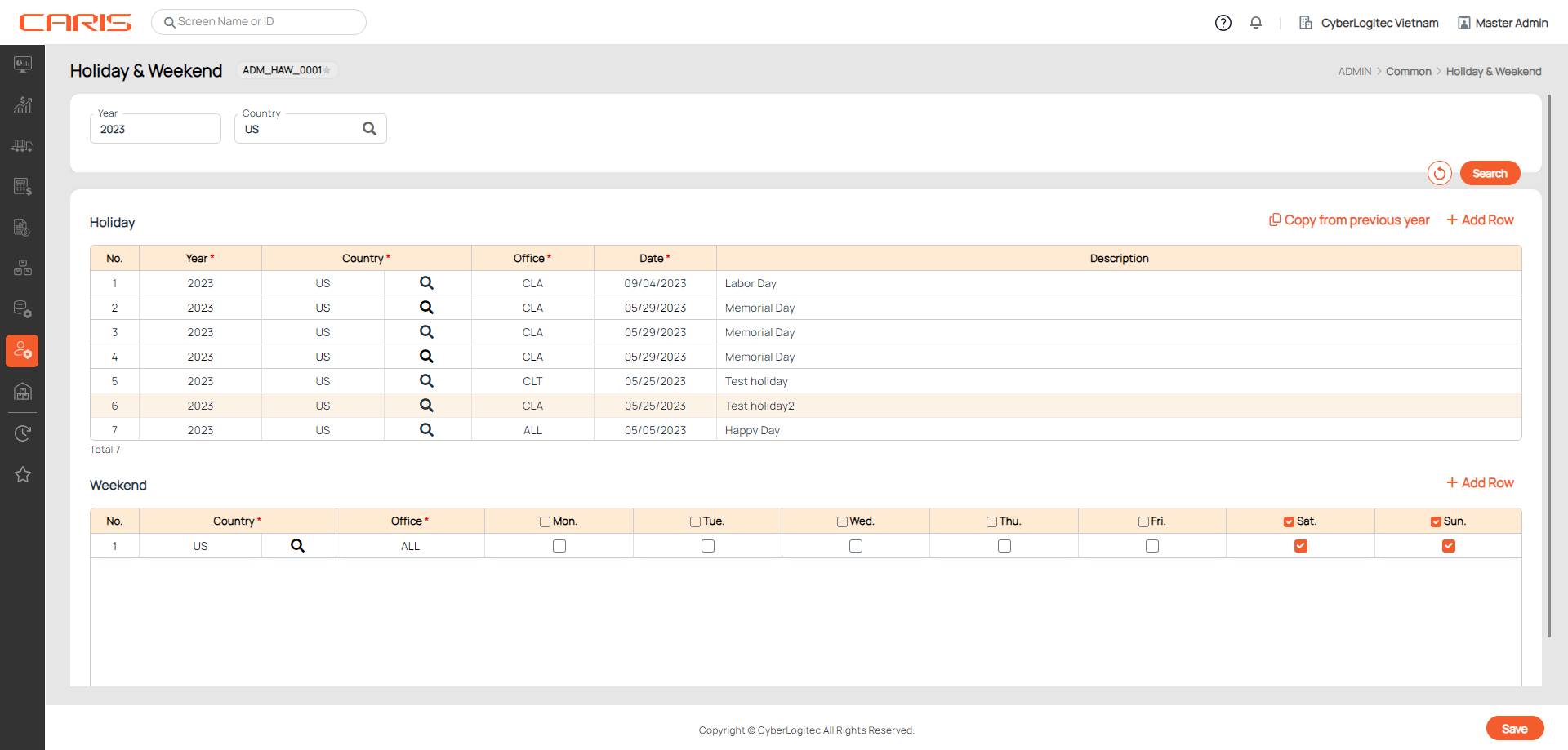 The Holiday & Weekend screen allows you to set up holidays and weekends across different countries and offices. This setup will be linked to Alert and Checklist features.
