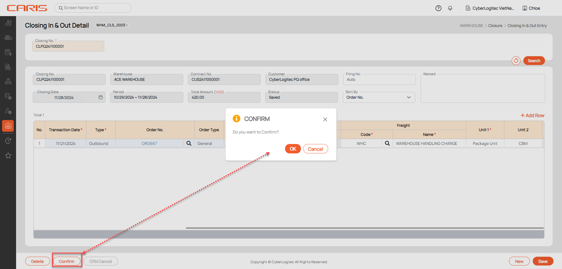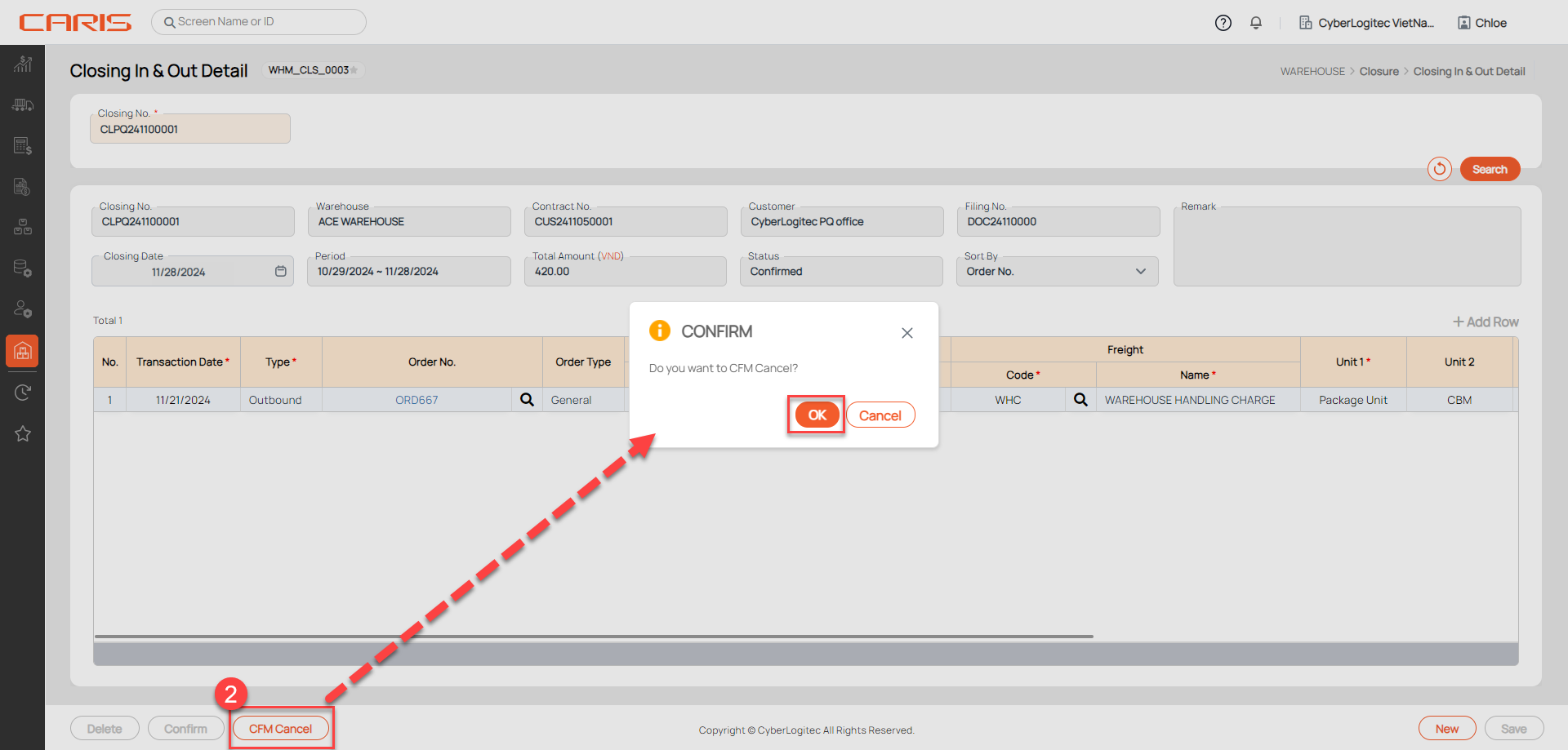 After confirming successfully: can't edit Closing information, the status will be updated to Confirmed and the CFM Cancel button will be shown on the screen.