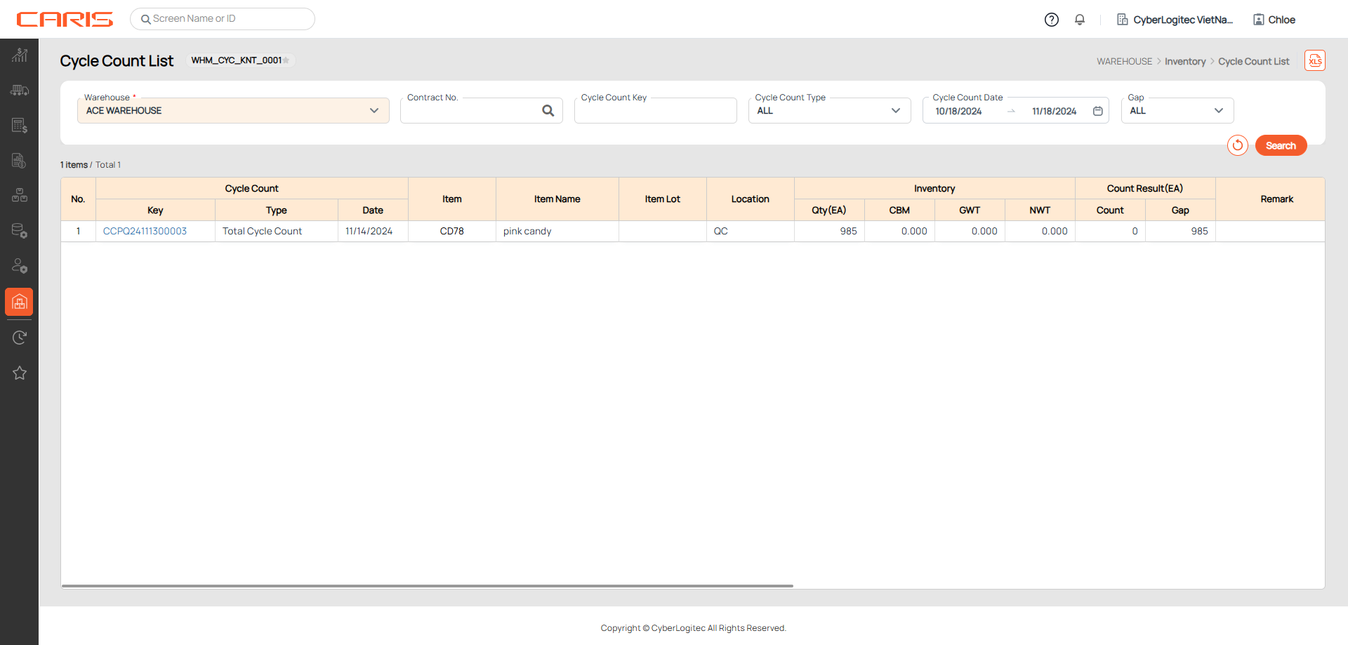 Navigation: Warehouse > Inventory > Cycle Count List