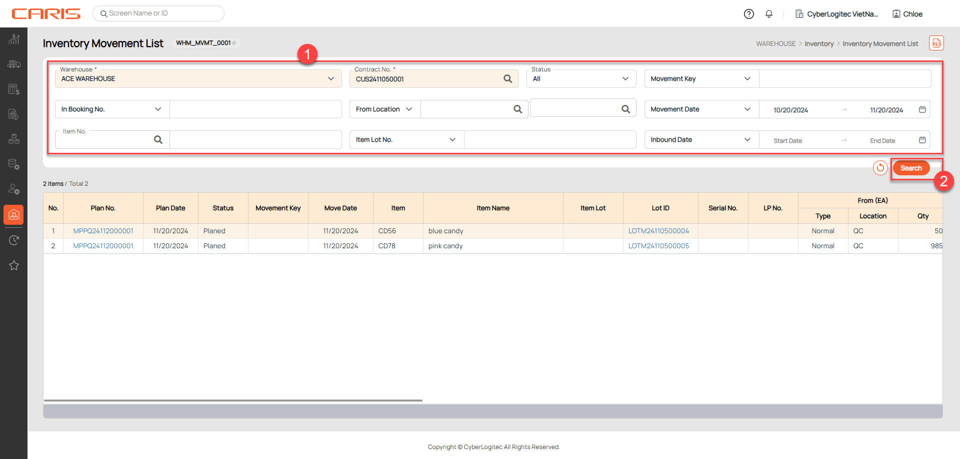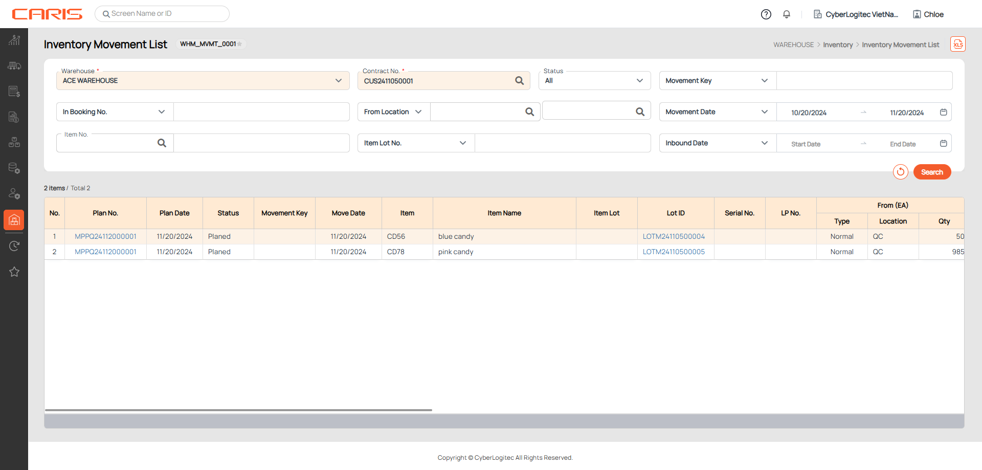 Navigation: Warehouse > Inventory > Inventory Movement List